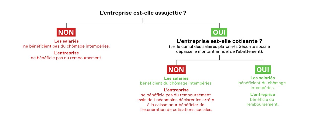 Le régime de chômage intempéries s’applique aux entreprises du BTP exerçant une activité citée par le code du travail en référence à la Nomenclature des activités économiques de 1959. L'entreprise ne cotise que si sa masse salariale excède un seuil d'abattement dont le montant est révisé chaque année.